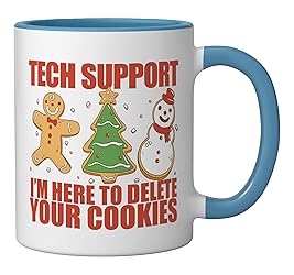 TECH SUPPORT. I'M HERE TO DELETE YOUR COOKIES. Funny Christmas design for your favorite developer who codes all day! Features gingerbread and sugar cookies in the shape of a ginger bread man, Xmas tree, and a snowman cookie. If you're a professional front-end, backend, full-stack, software, or UI/UX developer, you know how easy it is to obsess over codes and programming languages.Click brand name for more funny coding memes for the holidays. 11-ounce ceramic mug is dishwasher and microwave-safe, lead and BPA free Features glossy finish with accent colors on interior, handle, and rim of two-tone designs