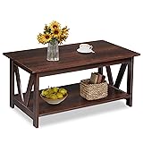 【Farmhouse Charm with Functional Style】This rustic farmhouse coffee table blends a warm wood-grain top with a crisp wood frame, creating a classic centerpiece for your living room, bedroom, or balcony. 【Durable V-Frame Support Structure】Crafted from high-quality medium-density fiberboard, this small coffee table for living room features a sturdy 2-tier design with V-shaped side panels that provide enhanced stability and support. 【Large 2-Tier Storage for Daily Essentials】Keep your space organized with the spacious dual-layer open shelf—perfect for books, decor, baskets and snacks—while the wide coffee table top provides plenty of room for coffee, games, or gatherings. 【Vintage Style】With its classic colors, this sofa side table with charging station blends perfectly into any decor and easily creates a stylish vibe in your home. 【Easy-Charging】This small end table has 2 AC outlets and 2 USB ports. The spacing is sufficient, which satisfies you to use multiple plugs simultaneously, keeping power at your fingertips and never worrying about charging when you use your electronic devices on the couch.