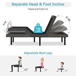 【Precise Dual-Motor Adjustment & One-Touch Smart Presets】 This smart bed base features independent dual motors, allowing you to precisely raise the head (0-60°) and foot (0-40°) to your perfect angle for reading, watching TV, or relieving back pressure. Enjoy one-touch access to Zero Gravity for weightless relaxation, Anti-Snore for clearer breathing, and your favorite custom TV Mode. The ultra-quiet motors ensure smooth, undisturbed adjustments. 【3-Height Adjustable Legs & Smart Storage】 Customize your bed height for comfort and convenience with three leg options (4", 8", or 12"). The lower settings facilitate easy entry and exit (ideal for seniors or children), while the tallest setting creates generous under-bed clearance for storing bins, suitcases, or organizers, helping you maximize bedroom space and minimize clutter. 【Convenient LED Lighting & Dual USB Charging】 Navigate safely at night with the soft, wireless remote-controlled LED under-bed lighting. Stay powered up with both USB-A and USB-C ports conveniently integrated on each side of the base, allowing you and your partner to charge phones and devices without cluttering the floor with cords or searching for outlets. 【Heavy-Duty Construction & True Split King Design】Engineered for lasting durability, this bed base supports up to 750 lbs total weight, ensuring rock-solid stability for years. Designed as a true Split King, it features two independent Twin XL bases that work seamlessly together—allowing each sleeper to enjoy personalized comfort settings without compromise. Robust construction meets intelligent design for a secure, reliable foundation. 【Universal Mattress Fit & Effortless Setup】 Engineered for universal compatibility, this base seamlessly supports all mattress types from 8 to 14 inches thick, including memory foam, hybrid, latex, and innerspring. Assembly is straightforward and tool-free—simply attach your chosen legs and connect the cords. Enjoy a sturdy, reliable foundation that’s ready for rest in no time, backed by dependable support.