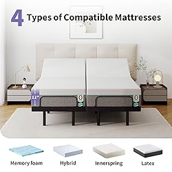 【Adjustable Bed Frame & Independent Head and Foot Incline】Independently adjust head (0-60°) and foot (0-40°) positions to relieve back pressure and improve circulation. Activate one-touch Zero Gravity mode for optimal relaxation, perfect for reading, watching TV, or enhancing sleep comfort. 【Wireless Remote Control with Bedside Storage Pocket Convenience】Easily operate your bed with the included wireless remote. Enjoy 2X4 USB ports (Type-A & Type-C Port on each side) for simultaneous device charging and a built-in storage pocket to keep essentials organized—all within arm’s reach for maximum convenience. 【Under-Bed Lighting & Flexible Height Options】Navigate safely at night with soft under-bed LED lighting. Customize your setup with 4+ 8-inch adjustable legs to fit platform beds, traditional frames, or floor use—offering versatile compatibility for any bedroom layout. 【STABLE Construction & QUIET Operation】Engineered with a reinforced steel frame that supports up to 800 lbs, this bed ensures unwavering stability for all body types. Paired with a luxuriously thick, noise-absorbing mattress, it delivers cloud-like comfort while maintaining near-silent operation during adjustments—perfect for undisturbed relaxation, whether you're enjoying solo downtime or sharing the space with a partner. 【Tool-Free Assembly & Universal Compatibility】Set up in minutes—no tools required. Simply unfold the frame, attach your preferred legs, and place your mattress. Compatible with most 8"-14" mattresses, offering a hassle-free upgrade to smart sleeping comfort.