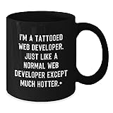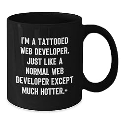 - Get ready to make your web developer friend's day with our hilarious 'I'm a tattooed web developer' black coffee mug. Perfect for a birthday gift, this ceramic mug is not only funny but also functional. Available in 11oz and 15oz capacities, it's microwave and dishwasher safe. Whether you're a coworker, friend, or family member, this gift is sure to bring a smile to their face. So, go ahead and order this unique gift for your favorite web developer today! As a web developer, your friend spends most of their time coding, debugging, and testing. But they also need a break, and that's where our coffee mug comes in. Made from high-quality ceramic materials, this mug will keep their coffee hot for hours. Plus, it's dishwasher safe, making it easy to clean and maintain. Whether you're looking for a birthday gift, a funny present, or just a way to show your appreciation, this web developer coffee mug is the perfect choice. It's a thoughtful and unique gift that any web developer would love to receive. So, why not order one today and make your friend's day a little brighter? So, what are you waiting for? Order this funny web developer gift today and make your friend's day a little brighter. It's a thoughtful and unique gift that they'll cherish for years to come. Trust us, they'll love it!