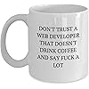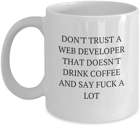 - The white color of the mug makes it a great addition to any office or home coffee station. The quote 'Don't trust a web developer that doesn't drink coffee and say fuck a lot' is sure to bring a smile to their face. This web developer coffee mug is a unique and thoughtful way to show your appreciation for their hard work.