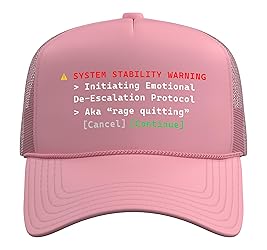 A unique statement that says, "System Stability Warning: Initiating Emotional De-Escalation Protocol. Aka Rage Quitting". A funny computer error prompt meme for gaming frustration. Great for gamer teens, kids, and gamer girls. Five-panel trucker hat featuring structured foam front, mesh back, and high-profile crown Adjustable fit; one size fits most adults