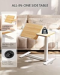 Height Adjustable C-Shaped End Table for Sofa & Bedside:One-touch gas spring lift lets you smoothly adjust the height from 25.6" to 41.1", making this side table easy to use next to sofas, chairs, or beds—no power needed. Split Tilting Desktop – Two Surfaces, More Flexibility:Spacious 31.6" × 15.7" tabletop features a smart split design: a 19.8" × 15.7" tilting section adjusts up to ±54° for reading or laptop use, while the 11.8" × 15.7" fixed surface keeps drinks, books, or phones secure. Space-Saving C-Shaped Design Slides Under Furniture:Single-column C-frame allows the table to slide closely under sofas and beds, bringing the surface right to your side—ideal for small living rooms, bedrooms, or apartments. Hidden 360° Swivel Wheels for Easy Movement:Four built-in hidden casters glide smoothly in any direction, allowing you to roll the table effortlessly from couch to bedside without lifting. Ultra-Slim Base Fits Low-Clearance Furniture:Super-thin base measuring only 1.18" high fits under sofas or beds with minimal clearance, making this mobile end table perfect for tight spaces.