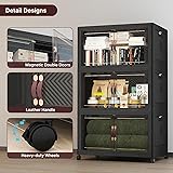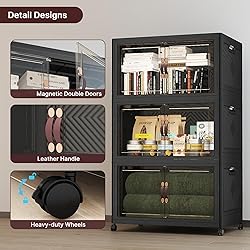 UAMFURI Extra Large Stackable Storage Bins, Lockable Storage Bins with Lids, Folding Storage box with Doors and Wheels, Collapsible Plastic Drawers for Home, Garage, Office (6, Black, Extra Large)