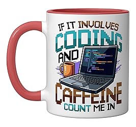 This computer science themed design features a pixel art laptop and coffee mug with the quote 'IF IT INVOLVES CODING AND CAFFEINE COUNT ME IN'. Perfect for every software engineer, web developer, and tech geek. 11-ounce ceramic mug is dishwasher and microwave-safe, lead and BPA free Features glossy finish with accent colors on interior, handle, and rim of two-tone designs