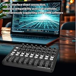 [Universal Compatibility & Premium Build] This midi keyboard connects via usb-c for seamless compatibility across all platforms. it supports a wide range of music software, ensuring a versatile creative ecosystem. the durable abs construction and compact design (24.6 x 17.5 x 3.5 cm) make it perfect for studio and on-the-go use. [Programmable Buttons for Creative ] The 18 programmable buttons feature high-sensitivity silicone mechanical keys, allowing you to map any function within your software. instantly trigger effects, loops, or samples with a single touch, enhancing your workflow and sparking creativity effortlessly. [Precision Faders for Immersive Mixing] Equipped with 9 high-precision faders offering 128 levels of displacement sensing, this midi keyboard delivers studio-grade control. experience smooth and accurate adjustments for mixing and mastering, giving you professional sound control at your fingertips. [Fully Customizable Control] This midi keyboard controller features 24 assignable knobs that can be tailored to your preferred settings via dedicated software. easily adjust parameters like volume, pitch, and effects to perfect your sound. the intuitive interface ensures seamless customization, making it ideal for both beginners and professionals. [ Sync for Seamless Workflow] The innovative sync button synchronizes all control parameters (knobs, faders, and buttons) with your music software instantly. enjoy smooth transitions and uninterrupted creativity, whether you're recording, performing, or producing.