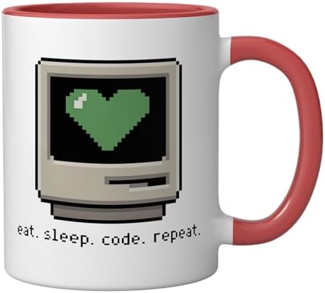 Eat Sleep Code Repeat Pixel Art Retro Computer Programmer Ceramic Mug, Red/White