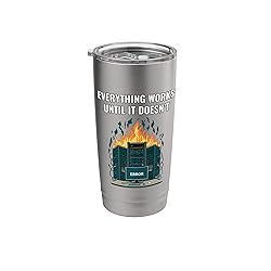 Everything Works Until It Doesn’t Funny design shows a burning server room with an error screen, capturing the reality of outages, failures and unexpected production issues. Server Room and System Error Theme Visual focus on server racks, cables, monitoring equipment and a workstation displaying a large ERROR message for clear IT context. Dual wall insulated: keeps beverages hot or cold Stainless Steel, BPA Free Leak proof lid with clear slider