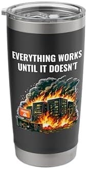 - Everything Works Until It Doesn’t Funny design shows a burning server room with an error screen, capturing the reality of outages, failures and unexpected production issues.