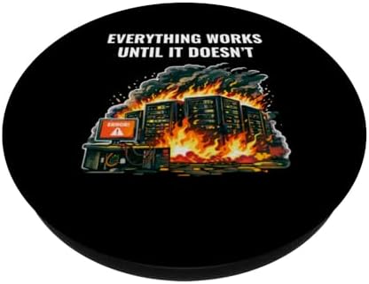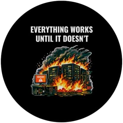 - Everything Works Until It Doesn’t Funny design shows a burning server room with an error screen, capturing the reality of outages, failures and unexpected production issues.