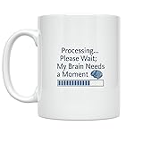 HUMOROUS DESIGN: Features a relatable 'Processing... Please Wait; My Brain Needs a Moment' message with loading bar and brain icon in calming blue and grey tones, perfect for expressing those moments when you need a mental break. DOUBLE-SIDED PRINT: High-quality design printed on both sides of the mug ensures the message is visible from any angle, making it a great conversation starter at home, office, or classroom. DURABLE CERAMIC CONSTRUCTION: Made from sturdy white ceramic material with 11 oz capacity, ideal for enjoying your favorite coffee, tea, or hot beverage during daily routines or study sessions. EASY CARE: Dishwasher and microwave safe for convenient cleaning and reheating, while the lightweight design makes it comfortable to hold and use throughout the day. THOUGHTFUL GIFT IDEA: Perfect for students, teachers, professionals, or anyone who appreciates understanding and empathy, adding a supportive and lighthearted touch to any space or desk setup.