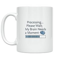 - This thoughtful 11 oz white ceramic mug brings awareness and understanding to the learning process with its clever "Processing... Please Wait; My Brain Needs a Moment" message. Featuring a calming design with a loading bar and brain icon in soothing blue and grey tones, this mug speaks to anyone who needs a little extra time to process information. The high-quality print appears on both sides of the mug, ensuring the supportive message is visible from any angle. Perfect for teachers, students, professionals, or anyone navigating learning differences, this mug transforms your daily coffee or tea break into a moment of self-compassion and understanding. The durable ceramic construction is both dishwasher and microwave safe, making it practical for everyday use at home, in the office, or in the classroom. The simple sans serif typography ensures the message is clear and easy to read, while the round shape and comfortable handle provide a pleasant drinking experience. This mug serves as a gentle reminder that everyone's brain works differently, and that's perfectly okay. It makes a meaningful gift for educators, students with learning disabilities, or anyone who appreciates empathy and patience in our fast-paced world.
