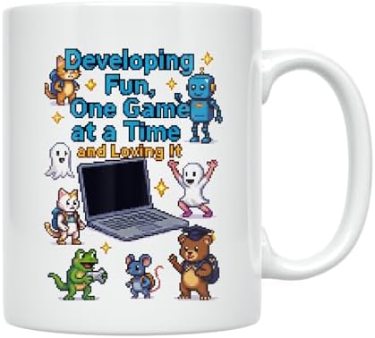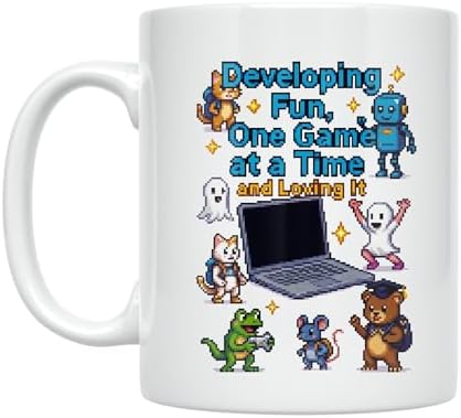 Celebrate the passion for game development with this Junior Game Developer Coffee Mug, featuring the inspiring message 'Developing Fun, One Game at a Time and Loving It'. This 11 oz white ceramic mug showcases a vibrant pixel art design with a laptop at the center, surrounded by an array of whimsical characters including robots, ghosts, dinosaurs, and bears. The playful design captures the creative spirit of coding and gaming, making it perfect for aspiring developers, students, and technology enthusiasts. Crafted from high-quality ceramic, this durable mug is designed for daily use at home, in the office, or during study sessions. The design is printed on both sides for easy viewing, ensuring the colorful artwork and motivational text are always visible. The comfortable handle provides a secure grip for your morning coffee, afternoon tea, or evening hot chocolate. This round-shaped mug measures 3.8 inches in height and features a generous 11 fluid ounce capacity. It's dishwasher safe and microwave safe for convenient use and cleaning. Whether you're working on your latest coding project or taking a well-deserved break, this mug adds a fun and inspiring touch to any workspace or kitchen.