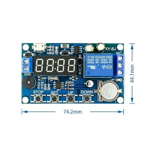 Timer SwitchesDescription:Real-time relay timing and clock synchronization time control delay 24H timing 5 time periodsProduct Highlights:Wide voltage power supply 5.0V ~ 60V;A mode can be set for multiple time periods, can reach 5 time periods;With a buzzer alarm function.Mode introduction:OPE: relay closing time point, CLE: relay off time pointTime period: PE-1 ~ PE-5 5 time periods (OPE to CLE is a time period)----: function shieldingP-1: The relay closes or outputs pulses every day to the OPE time point, and the relay turns off or outputs pulses to the CLE time point.P-2: set the day, to the OPE time point when the relay closed or output pulse, to the CLE time point when the relay disconnect / or output pulseP-3: set the date of the month, to the OPE time point when the relay closed or output pulse, to the CLE time point when the relay is off or output pulseP-4: Set the date 1 to date 2, start every day at the OPE time point, end to the CLE time point, relay action or output pulseP-5: As with P-4, only the month can not be setFirst, how to set the time?In the time to run the interface, press the DOWN button for a while:Step 1: Select the time period: PE-1 ~ PE-5 Press UP and DOWN to select;Step 2: Press the SET key to select the mode: P-1 ~ P-5 (Set this time period to the corresponding mode) by pressing the UP and DOWN keys. ("----" means to block this time period)Note: Each time period can be repeated from the "----", P-1 ~ P-5 of the optional; For example,you can let five time periods at the same time work in the P-1 mode, or let Time period 1 work in P-1 mode, time period 2 work in P-2 mode and so on.Step 3: After the mode selection is finished, press the SET key to enter the time period setting interface, set the interface in the time period, press the SET key to switch the parameter, "OPE" start time point, "CLE" end point, "dAE" date information;Additional features: Each "time period" can be set individuallyIn the specific parameter setting interface (after the second step), press the STOP button to switch the output mode:OUT1: Start time point turns on the relay, the end time is off the relayOUT2: Outputs 1S pulse to start or end timeIn the specific parameter setting interface (after the second step), press the STOP button for a while to switch the ringing mode:BLL0: Ring disableBLL1: Ring enableNote: When the bell rings, press any button to stop the ringSTOP key function expansion:Relay enable mode:1. ON: enable relay on;2. OFF: Do not turn on the relay, it is always off;Press the STOP button on the time display interface to switch between ON and OFF, the current status will flash, and then return to the main interface. (This function is the emergency stop function, press once to close the closed relay)After the relay is disabled, the product can be used as an alarm clock.Sleep mode:1. C-P sleep mode: within five minutes, without any , the digital tube automatically shut down the display, the program normal 2. O-d normal mode: digital tube is always open display;Press the STOP button for a while after 2 seconds to release, to achieve C-P and O-d state of the switch, the current state will flash, and then return to the main interface.==========Application : ComputerType : Voltage Regulator