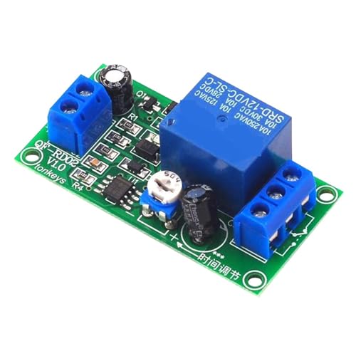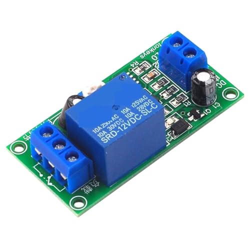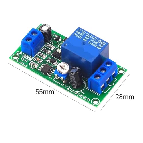 Timer SwitchesTime Adjsutable Delay Relay Module NE555 Timming Timer Relay Control Switch Board 12V DCFeature:Using NE555 IC. The delay range is 60 seconds adjustable.Specification:Working voltage: 12V DC, allowable range 10V-14.5VSuction current: 45mA 12V, 80mA 6VQuiescent current: 5mALoad switching capacity: 10A 250V AC or 10A 30V DCProduct weight: 19gNote:There may be slight size deviations due to manual measurement, different measuring methods and tools.The picture may not reflect the actual color of the item because of different photographing light, angle and display monitor.1 X Delay Relay Module==========Power Source : DCModel Number : Delay Relay ModuleVoltage : 12VDelay Relay Module : Time Delay Relay ModuleDelay Relay Module Adjustable : 12V Timer Delay Relay ModuleWorking voltage : 12V DC, allowable range 10V-14.5VSuction current : 45mA 12V, 80mA 6VQuiescent current : 5mALoad switching capacity : 10A 250V AC or 10A 30V DCSize : 55mm x 28mm, height <20mmProduct weight : 19g