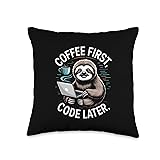 Coffee First Code Later Sloth Programming Throw Pillow
