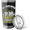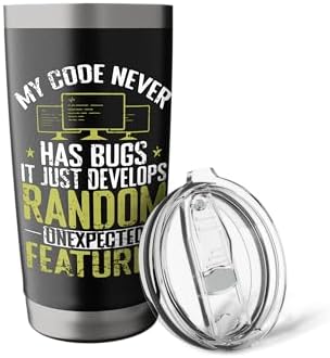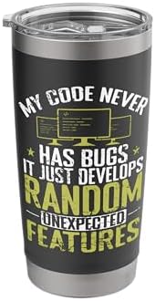 - Imaginative present on the topic programming. Related search words are computer, coding and software. Nice grafic for Computer Fans and Internet Nerds with the title: My Code Never Has Bugs, It Just Develops Random Unexpected Features.