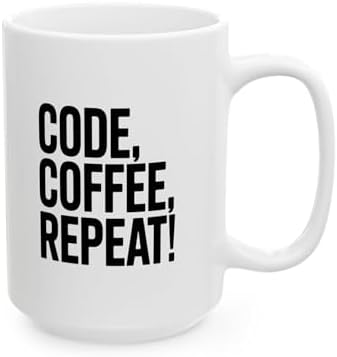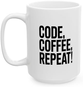 Kickstart your day with the perfect mug designed for coding enthusiasts Introducing our 'Code, Coffee, Repeat' ceramic mug, a must-have for every programmer and tech lover. Featuring bold, eye-catching typography, this durable white mug is available in both 11oz and 15oz sizes. The sleek black font contrasts beautifully against the pristine ceramic, making your favorite coffee, tea, or hot chocolate taste even better. It's not just stylish; it's functional, too The BPA and lead-free ceramic ensures a safe drinking experience, and being microwave and dishwasher-safe means easy cleaning and reheating. Perfect for the office or home workspace, this mug elevates your coffee moments and serves as a daily reminder to power through your coding tasks with a smile. Ideal as a gift for birthdays, holidays, or 'just because' occasions. Get your hands on this unique mug to recharge your creativity and fuel your coding passion. Don't miss out—order your 'Code, Coffee, Repeat' mug today and make each sip count