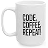 - Standout Design: Featuring bold black typography, this mug showcases the catchy phrase 'Code, Coffee, Repeat' for a fun and motivational touch.