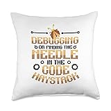 Coding themed programmer design for software developers and all programming lovers. Debugging Or Finding The Needle In The Code Haystack. 100% spun-polyester fabric Double-sided print Filled with 100% polyester and sewn closed Individually cut and sewn by hand Spot clean/dry clean only