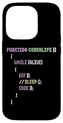 Funny programmer design styled like real code featuring “Function CoderLife()” and the lines While (Alive) { Eat(); //Sleep(); Code(); } in colorful coding text. Great gift idea for programmers, software developers, coders, computer science students, IT professionals, web developers, and tech geeks who love coding humor. Two-part protective case made from a premium scratch-resistant polycarbonate shell and shock absorbent TPU liner protects against drops Printed in the USA Easy installation