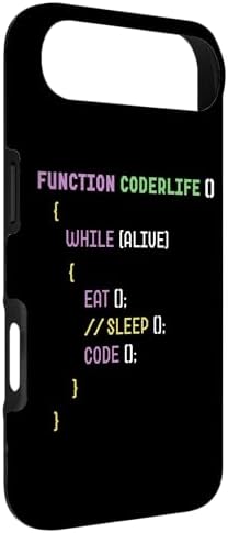 - Funny programmer design styled like real code featuring “Function CoderLife()” and the lines While (Alive) { Eat(); //Sleep(); Code(); } in colorful coding text.