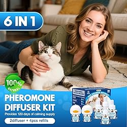 【Great Value 6-in-1 Pheromone Calming Diffuser Kit】Our pet pheromones calming diffuser 6 in 1kit includes 2 diffuser head, 4 x 48ml refills, enough to keep your home filled with tranquility. Our veterinary-formulated plug-in calming diffuser safely alleviate anxiety in Cat, fostering lasting relaxation and emotional balance for a stress-free home environment. 【Long-lasting Pet Soothing & Calming】The pheromones for cats diffuser helps reduce common signs of stress and can relieve cat daily stress, scratching, urine spraying, tension and conflict between cats, fears, and reactions to change. The pet pheromones calming diffuser kit easily covers an area of up to 700 square feet and can be used for 120 days(1-pack trial pack can be used for up to 30 days). The cat calming diffuser makes a nice and safe place for cats. 【Premium Natural Ingredients】Our pheromone diffuser is crafted with natural ingredients. The cat appeasing pheromone usd of natural care pheromones in our diffuser is designed to make cat feel more at ease and content. These pheromones are a great way to soothe your cat 's anxiety without any harsh chemicals. When you choose our pheromone diffuser for your cat , you are taking a big step towards enhancing your cat's overall well - being. This helps in building a more harmonious environment. 【Comprehensive Anxiety Easing】Cat calming diffuser is not only a sedative product, pheromones diffuser is designed to solve a variety of anxiety problems, pheromone by imitating the mother's pheromones, sending strong safety and comfort signals to Cats, so that they gradually calm down. Cat pheromone diffuser effectively relieves fear or stress caused by fear, noise, traffic, travel, veterinary visits, home alone, fireworks, thunderstorms, separation anxiety, etc. 【Suitable for cats of all ages and breed】The natural pheromones produced by cat Calming Diffuser are suitable for most breeds of cats, whether they are puppies or older cats, and will soothe, reassure, and relax your cat as they experience cat Calming Diffuser, helping to harmonize the relationship between cat and owner. The pheromone diffuser helps your pet feel calm again. It stops your cat from shaking because of anxiety and chewing things up. 【Notes on Use】Use cat Calming Diffuser in areas where your cat spends a lot of time, it will continue to send safe and comforting signals to your cat, relieving your cat's anxiety and calming your cat's mood, thus achieving a continuous calming effect. When inserting the pet calming diffuser. We recommend placing the calming pheromone in an area where your cat spends most of his time. Avoid stuffing the cat diffuser kit under shelves, behind doors, or under furniture in unventilated locations