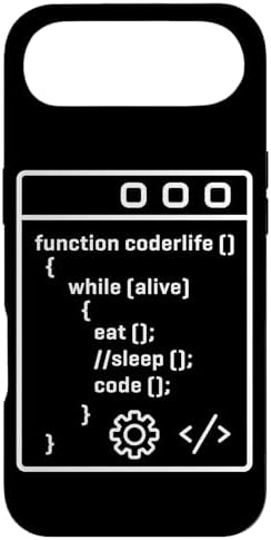 - Funny programmer design styled like real code featuring “Function CoderLife()” and the lines While (Alive) { Eat(); //Sleep(); Code(); } in colorful coding text.