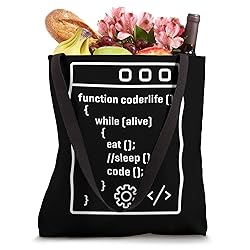Funny programmer design styled like real code featuring “Function CoderLife()” and the lines While (Alive) { Eat(); //Sleep(); Code(); } in colorful coding text. Great gift idea for programmers, software developers, coders, computer science students, IT professionals, web developers, and tech geeks who love coding humor. 16” x 16” bag with two 14” long and 1” wide black cotton webbing strap handles. Made of a lightweight, spun polyester canvas-like fabric. All seams and stress points are double-stitched for durability, and the reinforced bottom flattens to fit more items and hold larger objects. Spot clean/dry clean only.