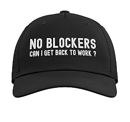 Funny design. No Blockers. Can I Go Back To Work? Great for any web or software developer or product owner. Great to wear to a daily standup. Classic five-panel structured baseball hat with high-profile crown Adjustable fit; one size fits most adults