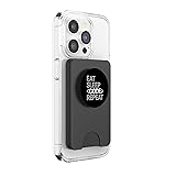 Eat Sleep Code Repeat programming MagSafe compatible wallets magnetically snap on and off your phone with ease,and come with a matching grip. Carries three cards for easy use. Adaptor ring included. Make any phone case MagSafe compatible by attaching the adaptor ring. A phone case is required but not included to use the wallet. Printed top is swappable. Close and twist to swap the top with a new design with other compatible PopGrip models.