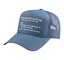 Grab this funny Procrasticoding Definition design for your programmer nerd dad, mom, husband, brother, friend or relative! It's the perfect geek gift idea & present for birthday, father's day, mother's day or christmas! This Procrasticoding Definition design is perfect for IT professionals, coders, computer engineers, software developers & tech support men & women who will proudly wear this information technology, coding, programming, cybersecurity tee Five-panel trucker hat featuring structured foam front, mesh back, and high-profile crown Adjustable fit; one size fits most adults