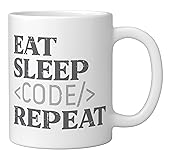Grab this funny Coder Eat Sleep Code Repeat design for your programmer nerd dad, mom, husband, brother, friend or relative! It's the perfect geek gift idea & present for birthday, father's day, mother's day or christmas! This Coder Eat Sleep Code Repeat design is perfect for IT professionals, coders, computer engineers, software developers & tech support men & women who will proudly wear this information technology, coding, programming, cybersecurity tee 11-ounce ceramic mug is dishwasher and microwave-safe, lead and BPA free Features glossy finish with accent colors on interior, handle, and rim of two-tone designs