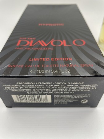 - Special EDITION Hypnotic Diavolo For Men By Antonio Banderas Intense EDT SPRAY 3.4 OZ NEW IN BOX Limited Edition ..RARE! —-///—— Diavolo Hypnotic by Antonio Banderas is a Amber Spicy fragrance for men. Diavolo Hypnotic was launched in 2005. Top notes are Bergamot and Citruses; middle notes are Geranium, Cinnamon and Leather; base notes are Sandalwood, Patchouli and Musk. Antonio Banderas presents Diavolo Hypnotic perfume pair in 2005. Diavolo Hypnotic opens with bergamot and citrus. The heart includes geranium, cinnamon and leather, while the base notes are patchouli, sandalwood and musk. Available as EDT.