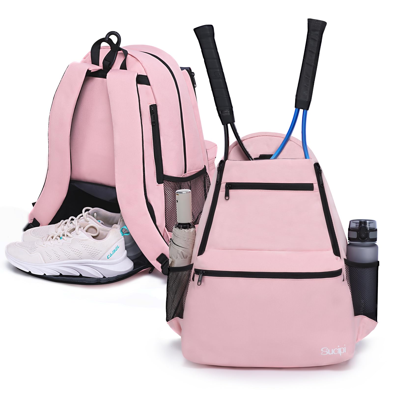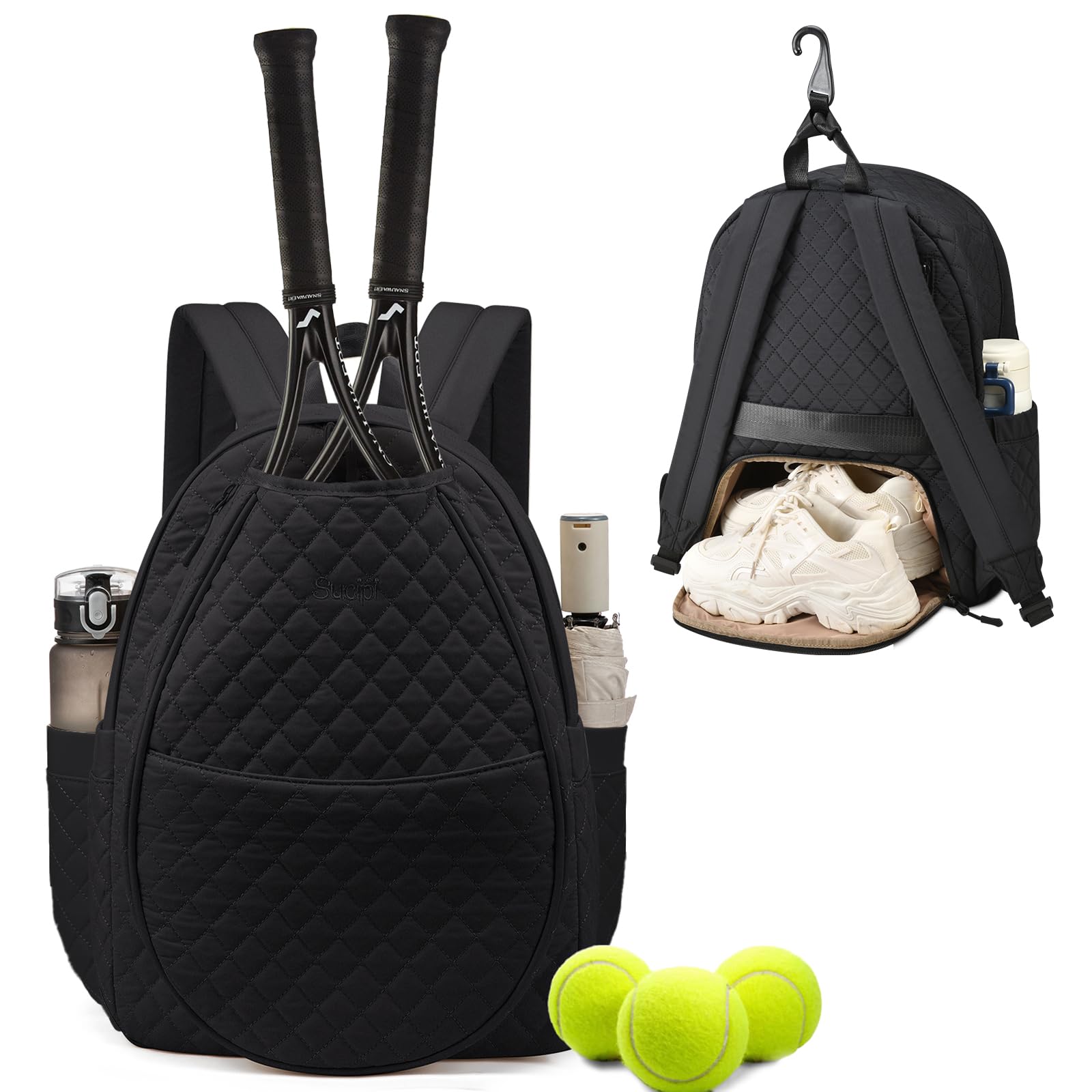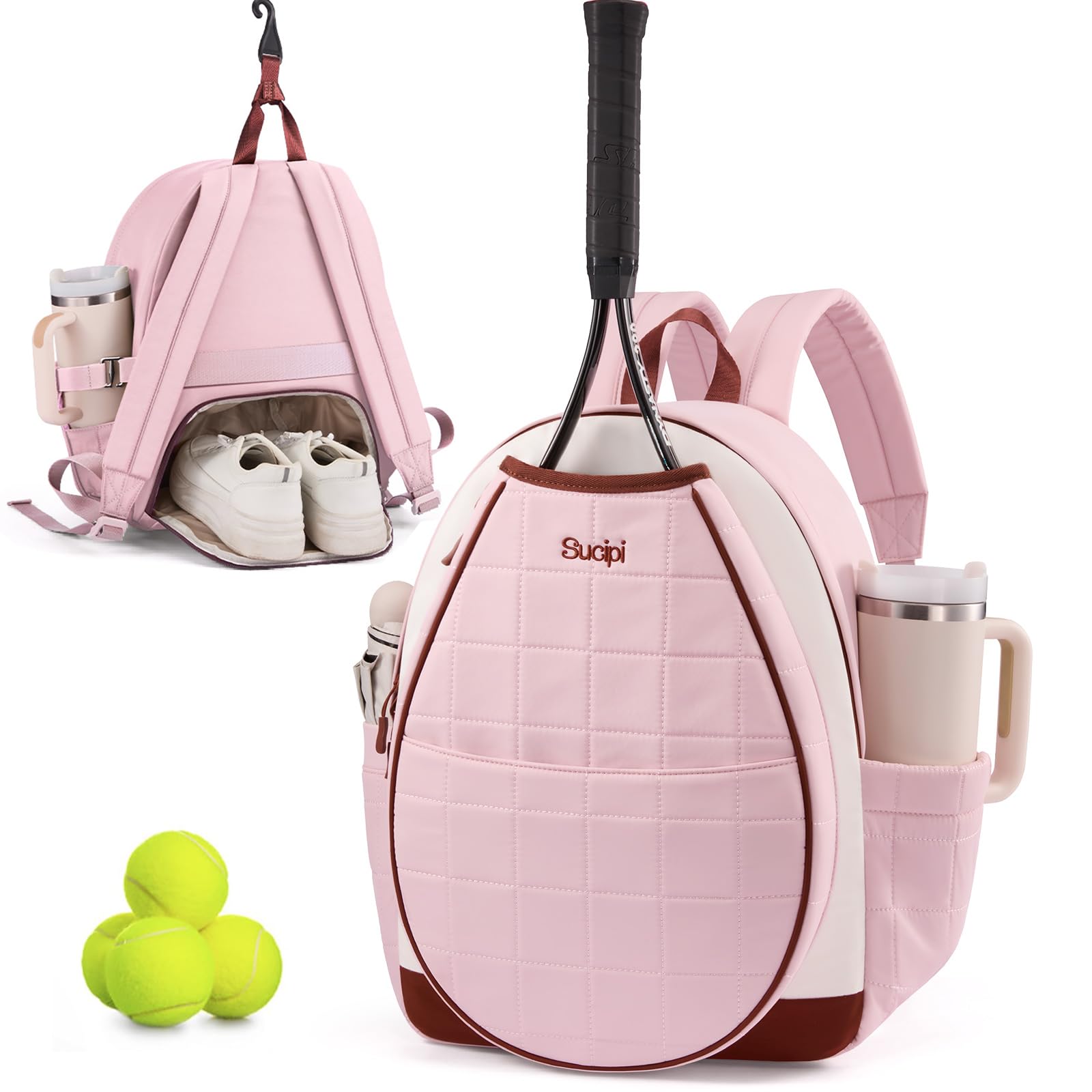 - 【Separate Racket Compartment】: Our tennis bags for women features a specially designed paddles compartment that can securely hold up to 2 tennis rackets or 4 pickleball paddles. Perfectly crafted for both pickleball enthusiasts and tennis players, this separate paddle storage area ensures that your equipment stays protected and easily accessible, providing dual functionality without taking up more space. 【Multifunctional Tennis Bag】: The main compartment of tennis racquet bag features a keychain, ensuring your keys are always within reach and securely stored. The back luggage strap allows you to effortlessly attach the bag to your rolling suitcase, making it the perfect travel companion. Additionally, the top removable fence hook provides easy access and quick hangability on court fences or gym walls, keeping your gear organized and accessible during matches or practice sessions. 【Multipurpose】: Sucipi tennis ball bag is designed with diamond embroidery, which is a perfect combination of fashion and function. It can be used not only as a tennis racket backpack, a pickleball bags for women, but also suitable for participating in tennis or pickleball games, physical education classes, gyms, etc.