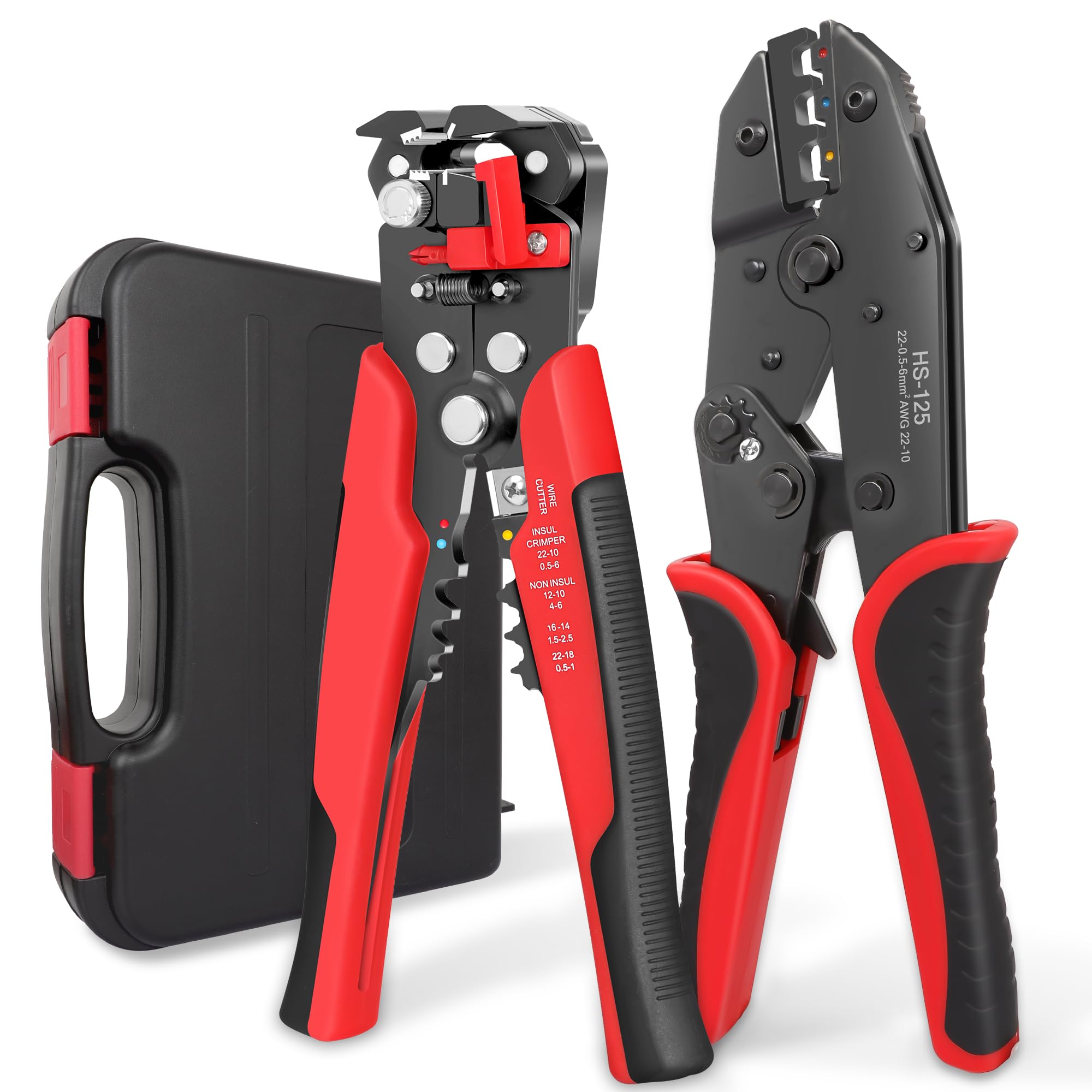 - These professional and practical wire crimper tools with self-adjustable crimping pliers feature convenience, efficiency, and harmlessness to the cable cores. It is easy to use, just hold the handle and manipulate it once to successfully press tight the wire and terminal blocks. Features: Due to great handle grasping position, light and compact structure and handle design ensure the perfect crimping effect. Professional wire crimper tool with self-adjustable ratchet mechanism and wire stripper, for easy operation. Applicable to most of non-insulated crimp terminals and connectors. With 4 interchangeable terminals with different crimping ranges. Multi-functional wire stripper for connectors from 24 to 10AWG (0.2-6.0mm²). Designed according to human factors engineering, it can save 50% energy when crimping. Specifications: Brand Name: Model: JX-D4301 Material: High-carbon Steel + Alloy Color: (Yellow + Black)/ (Red + Black) Optional Suitable Terminals & Crimping Range of Wire Crimper: 1. Color Code Nests + Insulated Terminals 24-14 AWG (0.25-2.5mm²), Hole Scope: 0.25, 1.5, 2.5; 2. Cord End Terminals 24-10 AWG (0.25-6.0mm²); 3. Non-insulated Open Barrel Connector 26-16 AWG (0.14-1.5mm²); 4. MC4 Solar Connector Terminals 14-10 AWG (2.5-6.0mm²). Stripping Range of Wire Stripper: 24-10 AWG (0.2-6.0mm²) Wire Crimper Size: Approx. 19 * 8 * 2.0cm / 7.48 * 3.15 * 0.79in Wire Crimper Weight: Approx. 348.5g / 12.29oz Wire Stripper Size: Approx. 21 * 10.5 * 2.8cm / 8.27 * 4.13 * 1.10in Wire Stripper Weight: Approx. 316g / 11.15oz Package Size: Approx. 28 * 14.5 * 6cm / 11.02 * 5.71 * 2.36in Package Weight: Approx. 1033g / 36.44oz Package List: 1 * Wire Crimper 1 * Wire Stripper 1 * S2 Screwdriver 1 * Storage Bag 3 * Spare Dies 4 * Screws