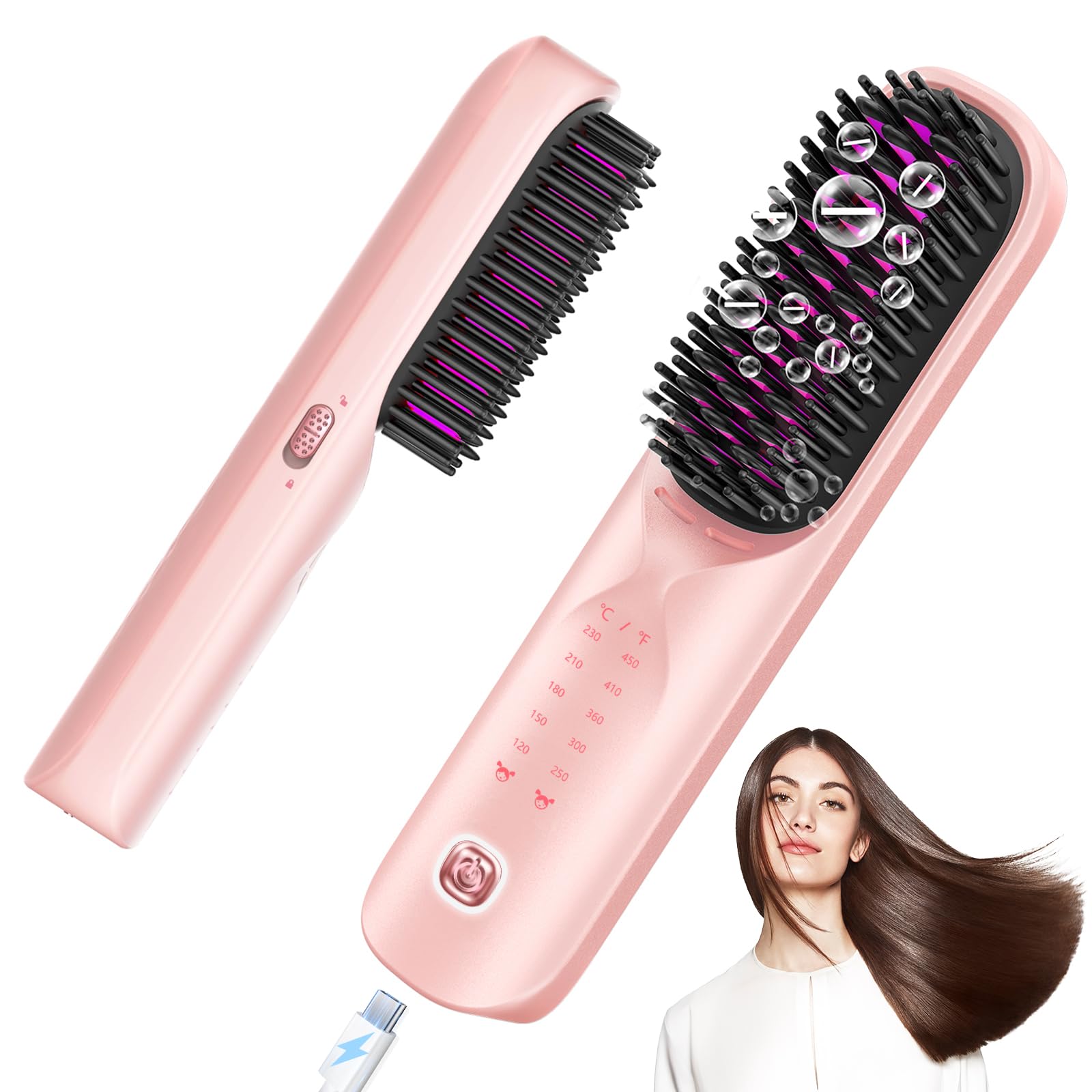 1.Cordless&Rechargeable: Equipped with a built-in 4000mAh rechargeable battery, this cordless hair straightener brush provides 3-5 uses on a single charge. Weighing just 174g (0.33 lbs), it's lightweight and easy to carry. 2.Energy Saving&Accurate instructions: The MCH technology ensuring the straightener brush a faster heating process while consuming less energy to reach the required temperature. The indicator light blinks while heating, and a steady light signals when the hair straightener brush is ready for use 3.Anion Released&High-Density: This straightener brush with ceramic-coated bristles releases 50 million anion to combat frizz and minimize damage. The high-density design of the comb allows for more effective hair styling, reducing tangles and enhancing smoothness 4.Easy to Use: No complex techniques required, you can use this hair straightener brush just like a normal comb, only 15 minutes needed to get beautiful straight hair. Feel free to contact us if you have any problem before or after perchasement, we will be delightful to help 5.Perfect Gift: The Cordless Hair Straightener Brush is an excellent choice for your girlfriend, sister, or best friend. This stylish and practical tool will delight anyone who loves to look their best" What's in the box 1 x Hair Straightener