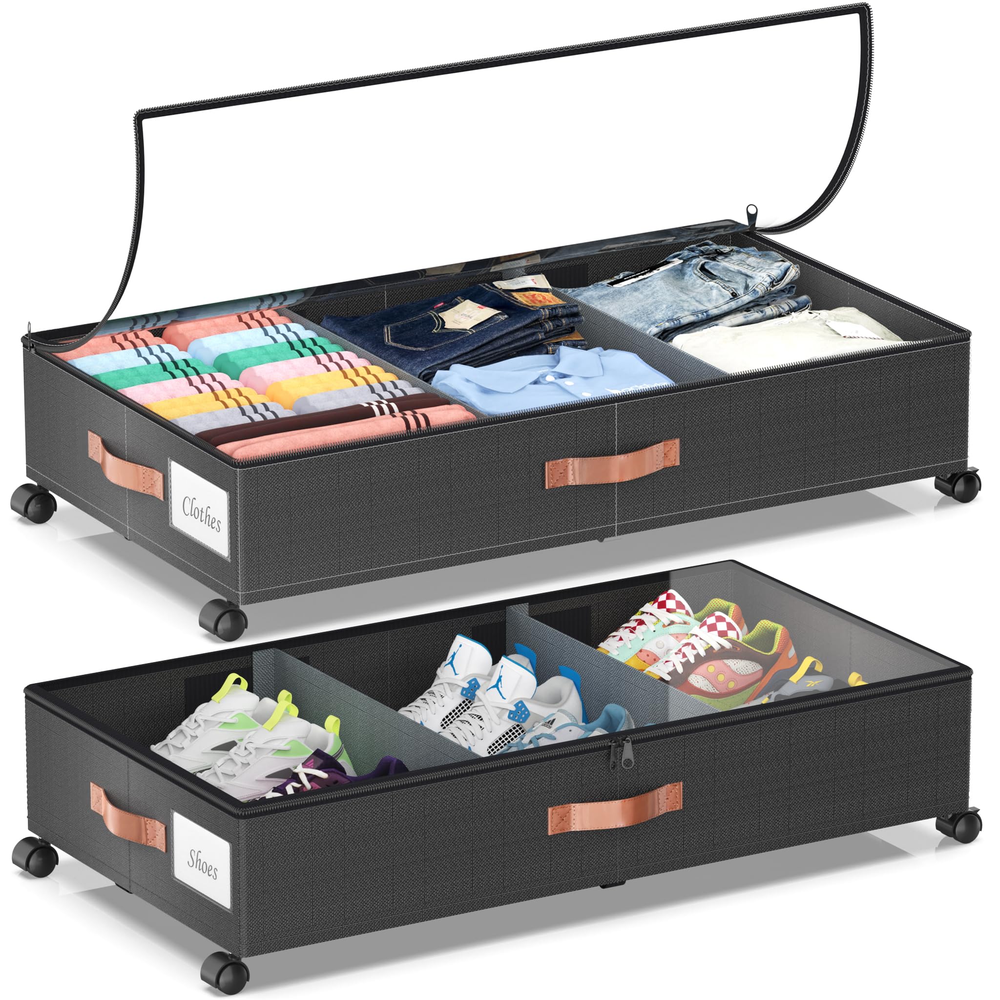 Under Bed Storage with Wheels, 2Pack Under Bed Storage Containers,Under Bed Shoe Storage Organizer with Clear Window&Label,Rolling Under Bed Storage Metal Drawer for Clothes,Shoes,Toys