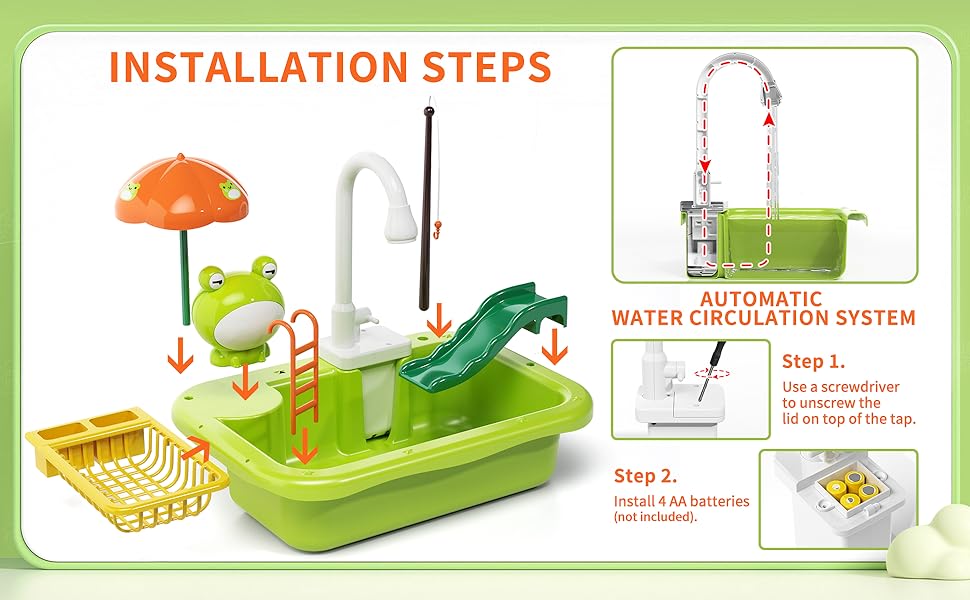 • Simulate Real Water Flow Design: Our dishwasher toy sink is equipped with upgraded electric faucet, It has automatic pumping and water circulation system that your child does not need to manually press the water pump. Simply fill the sink with water and turn the switch The water flows out of the tap, just like a real wash. Requires 4 AA batteries (not included).