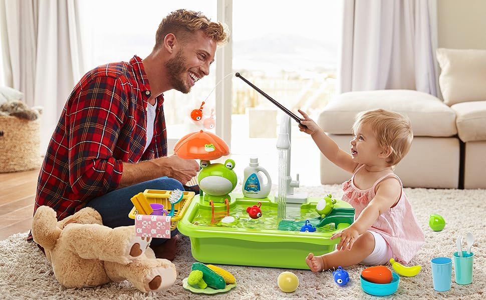 • 2 in 1 kitchen Sink Playset: This play kitchen sink and fishing game designed for kids, Equipped with electric faucet, play food, toy kitchen accessories, floating fishing toys, etc., Your kids can simulate real-life kitchen games water play and fun pool fishing games to cultivate their imagination and creativity!
