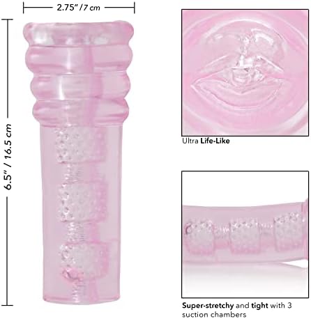- INSTRUCCIONES DE CUIDADO: Antes y después de cada uso, lave la acariciadora interna y externamente con agua y jabón suave, luego desinféctela con el limpiador universal de juguetes CalExotics. Cada funda mide 17 cm por 7 cm con una abertura apretada similar a la de la boca