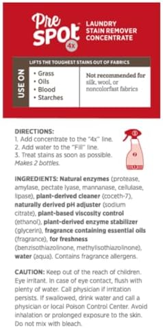 Tackle the toughest laundry stains with Melaleuca PreSpot 4x Concentrate Laundry Stain Remover. Powered by six natural enzymes, this stain-fighting formula effortlessly breaks down grass, oils, blood, starches, and more—giving your clothes a fresh, clean look without harsh chemicals. Made with plant-derived, biodegradable ingredients, PreSpot is safe for everyday laundry while being environmentally friendly. It contains no chlorine, no harsh solvents, and no optical brighteners, making it a gentler yet highly effective stain remover. Each 8 fl. oz. bottle makes up to 2 full spray bottles, ensuring long-lasting value. Simply dilute, apply directly to stains, and wash as usual for best results. Directions: Add concentrate to the “4x” line in a spray bottle. Fill with water to the “Fill” line. Apply to stains as soon as possible, then launder as usual. Caution: Keep out of reach of children. Avoid eye contact; rinse thoroughly with water if irritation occurs. If swallowed, drink water and seek medical advice. Do not mix with bleach.