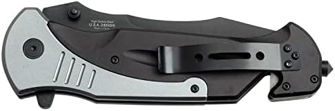 - SPECIAL FEATURES: Finger Flipper, Liner Lock, Grey and Black Aluminum Handle with Sheriff Medallion, Rope Cutter, Glass Punch, Pocket Clip.