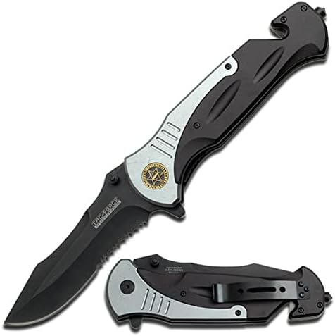 Tac-Force Folding Pocket Knife – Black Partially Serrated Blade, Grey/Black Aluminum Handle w/Sheriff Logo, Rope Cutter, Glass Punch, Pocket Clip, Tactical, EDC, Rescue - TF-727SH