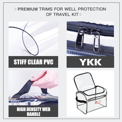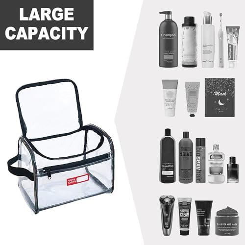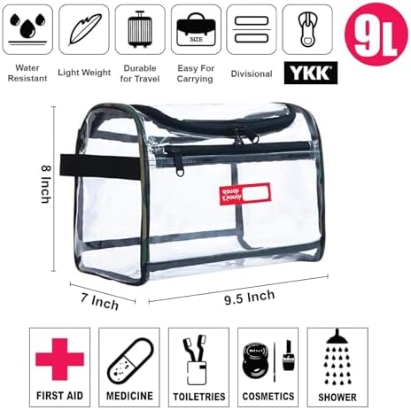 - Large Capacity Transparent Design: Extra large toiletry bag with 9 liters volume. Holds holiday travel essentials and accessories in one case. Front zipper pocket stores small makeup items securely and accessibly.Clear travel bag meets airport compliance for fast security checks. Easier to find contents and take out what you need