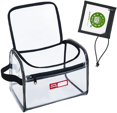 - Clear Toiletry Bag with Quality Made: Large clear makeup bag orgainzer made of thick and soft durable plastic water resistant fabric with camo piping trimming, 2 way YKK zipper closure. Name tag label and durable and sturdy handle for long holiday travel trip with safety in use for storage of toiletries and makeup stuff. Clear toiletry bag for traveling with Carry on roomy size: 9.5 x 7 x 8 inch