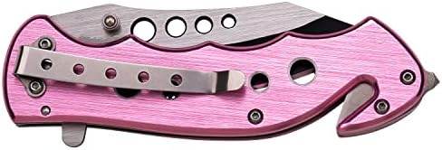 - SPECIAL FEATURES: Finger Flipper, Liner Lock, Pink Aluminum Handle with EMT Medallion, Rope Cutter, Glass Punch, and Pocket Clip.