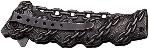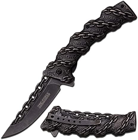 Navaja de bolsillo plegable con resorte Tac-Force, hoja y mango de acero inoxidable con acabado lavado a la piedra con diseño de eslabones de cadena esculpidos, incluye clip de bolsillo, Tactical, EDC, Rescue, TF-859