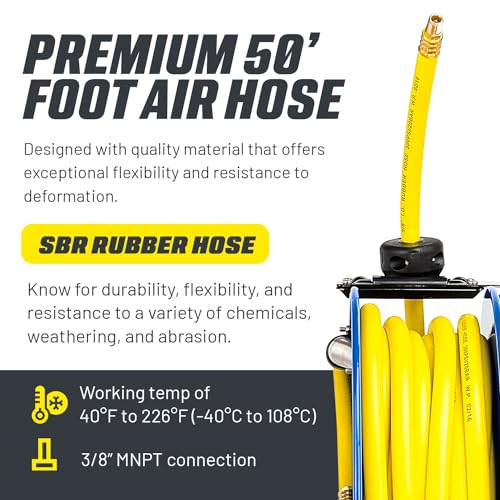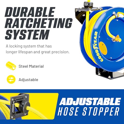 Goodyear Air Hose Reel Retractable 3/8" Inch x 50' Foot SBR Rubber Hose Max 300PSI Heavy Duty Industrial Steel Single Arm Construction